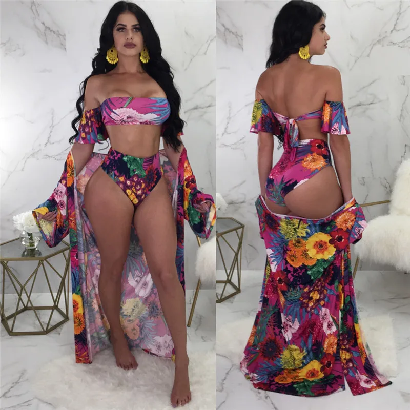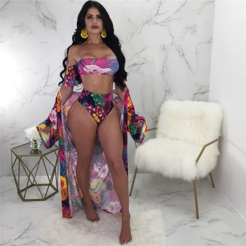 astounding 2019 Sexy Summer Beach 3 Piece Set Women Strapless Crop Tops + Shorts + Cardigan Women Floral Print