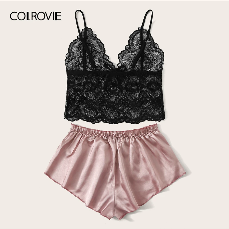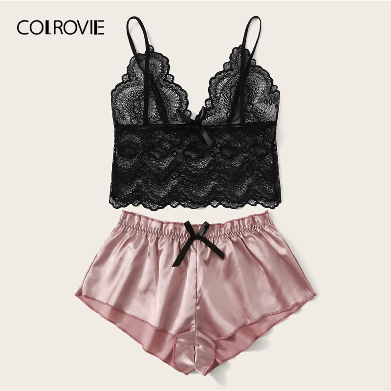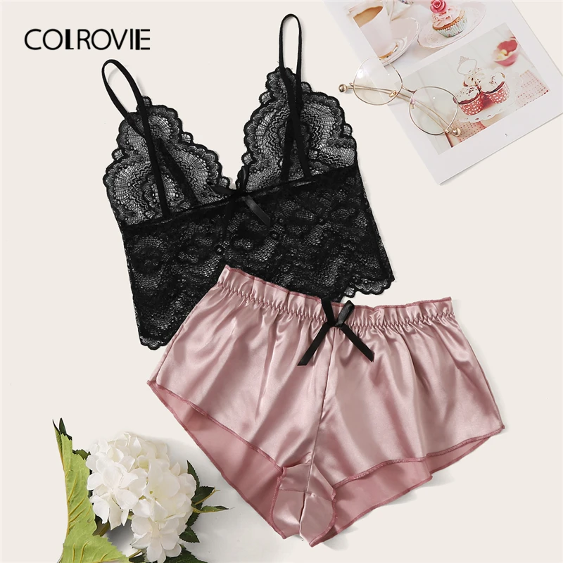 COLROVIE Pink Scalloped Floral Lace Lingerie Set Women Pajama Set 2019 Burgundy Bralettes And Briefs Sleepwear Sexy Nightgown,COLROVIE Floral Lace Bralette With Satin Shorts 2019 Sheer Sexy Sets Women 2019 New Stretchy Ladies Lingerie Sets, COLROVIE Floral Lace Bralette With Satin Shorts 2019 Sheer Sexy Sets Women 2019 New Stretchy Ladies Lingerie Sets