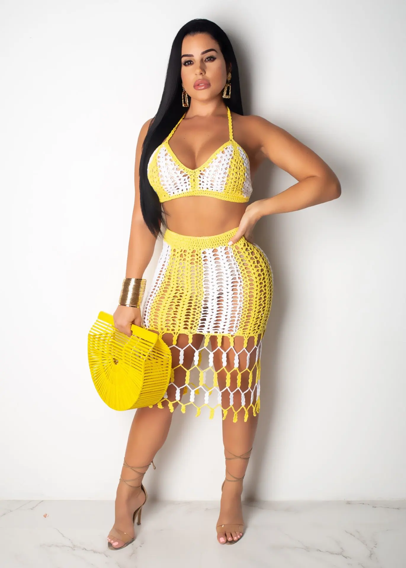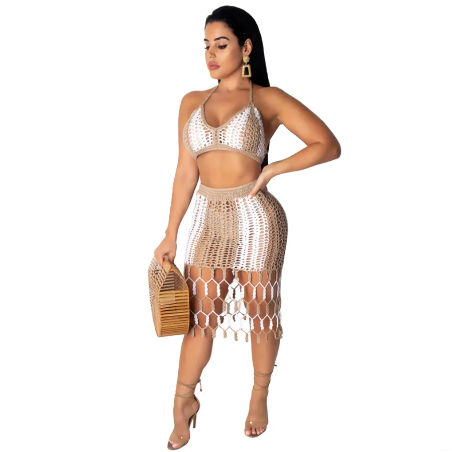 New Two-tone Stitching Hand-woven Bikini Top Mesh Short Skirt Suit Sexy Casual Beach Ladies AJ4072 Four