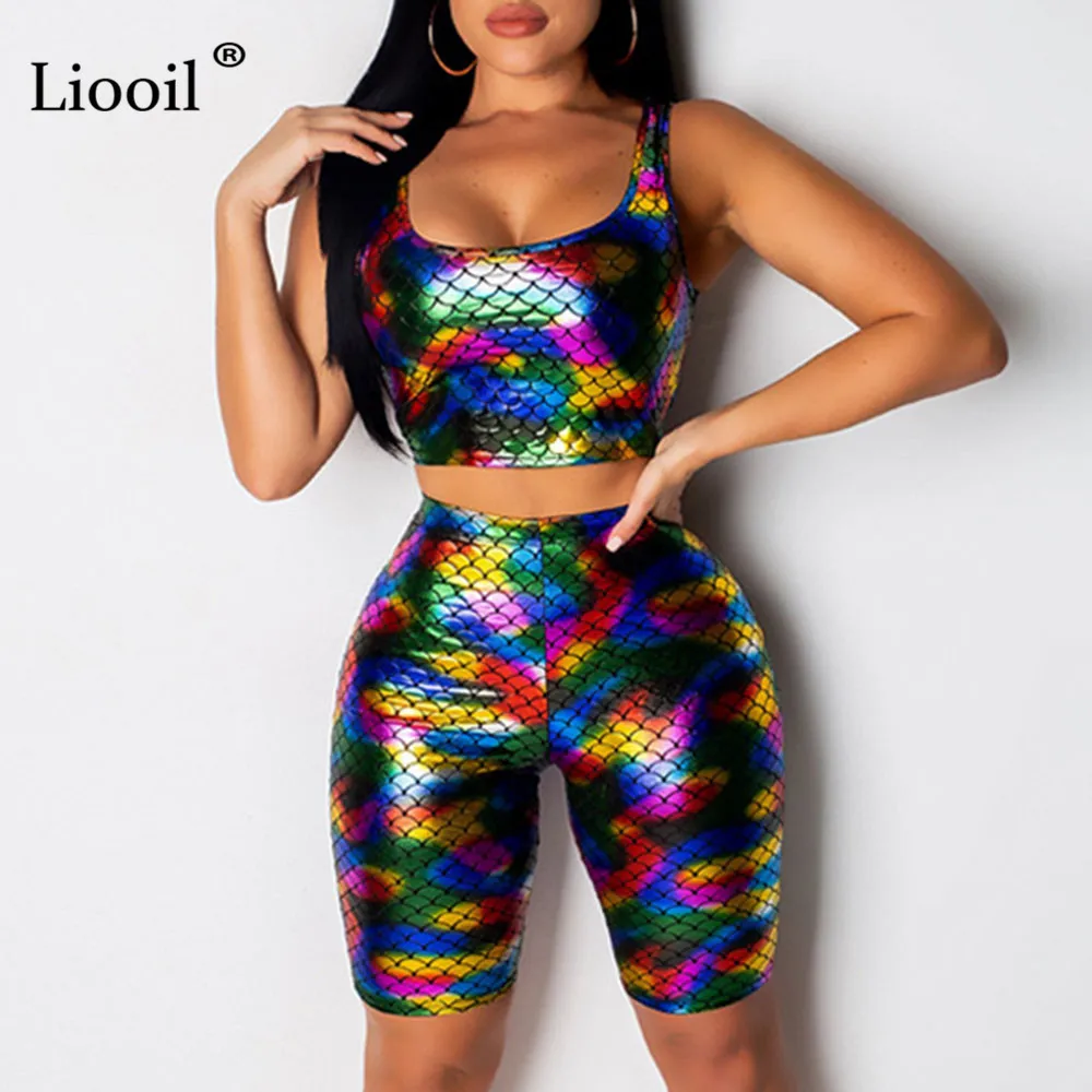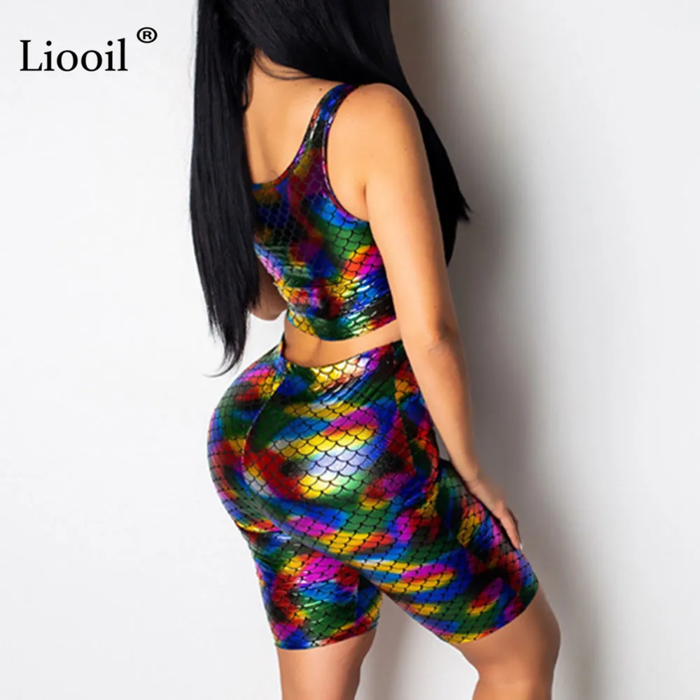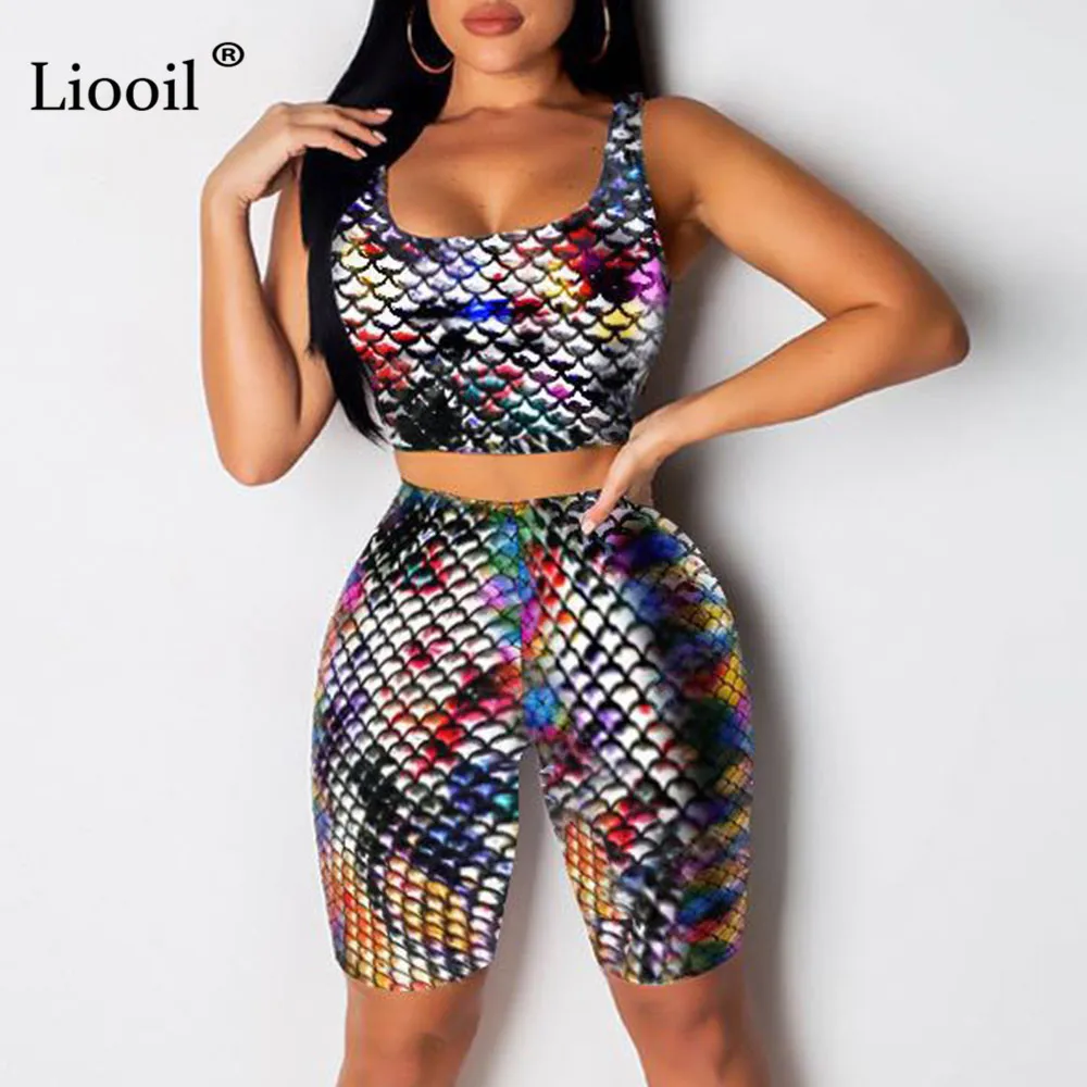 Ideal Liooil Fish Scale Sequin Print 2 Piece Set Women 2019 High Elastic Top And Pants High Waist Two Pie