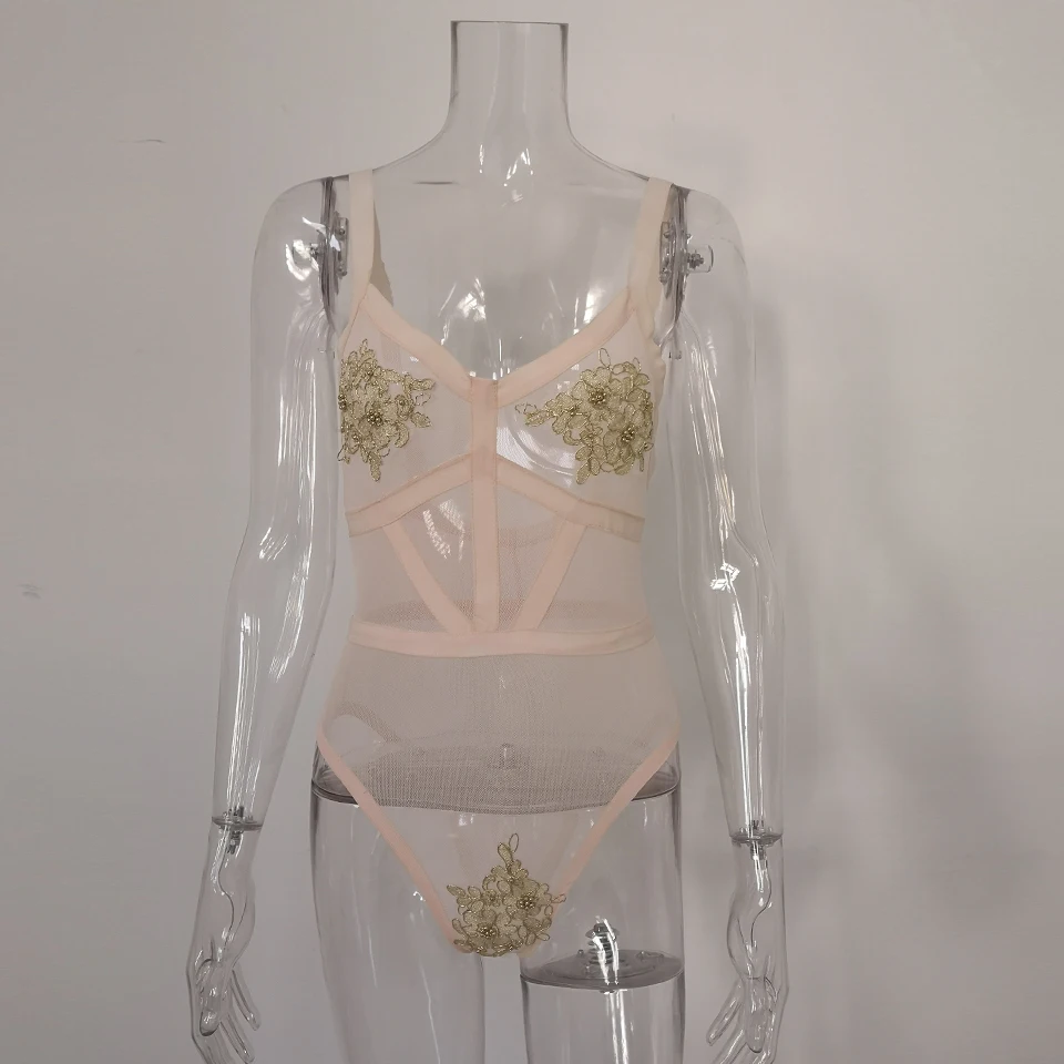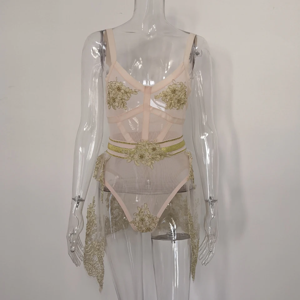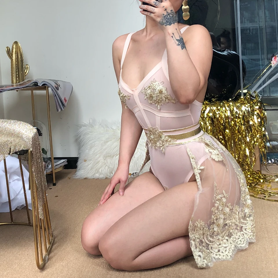 discount JillPeri Private Luxury Gold Pearl Perspective Mesh Bodysuit and Mini Skirt Two Piece Set Sexy Part