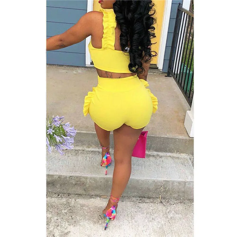 Promo Summer Fashion women crop tops High Waist Shorts 2pcs Ruffles Bow outfits Ladies Slim matching Clot